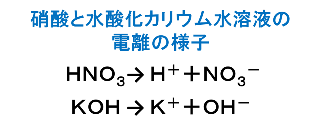 硝酸カリウムは水に溶けやすいため水溶液中では電離しています。
