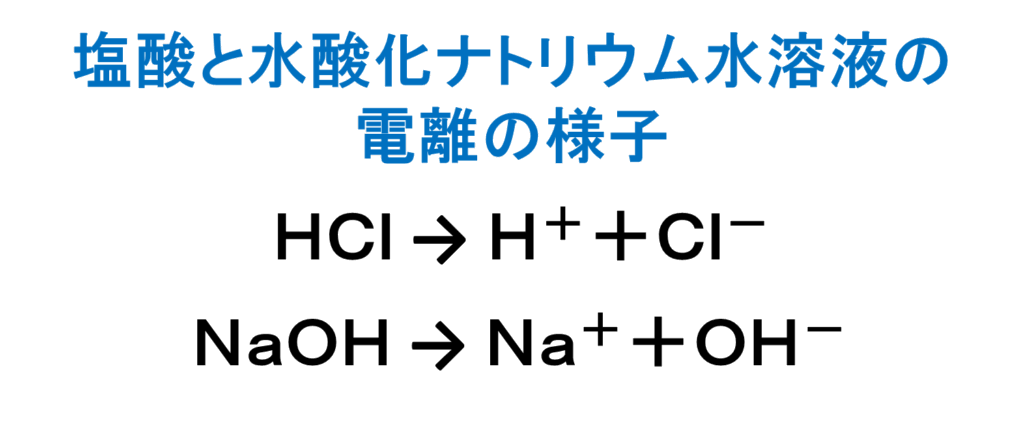 まずは塩酸と水酸化ナトリウムの電離の様子をおさらいしましょう。